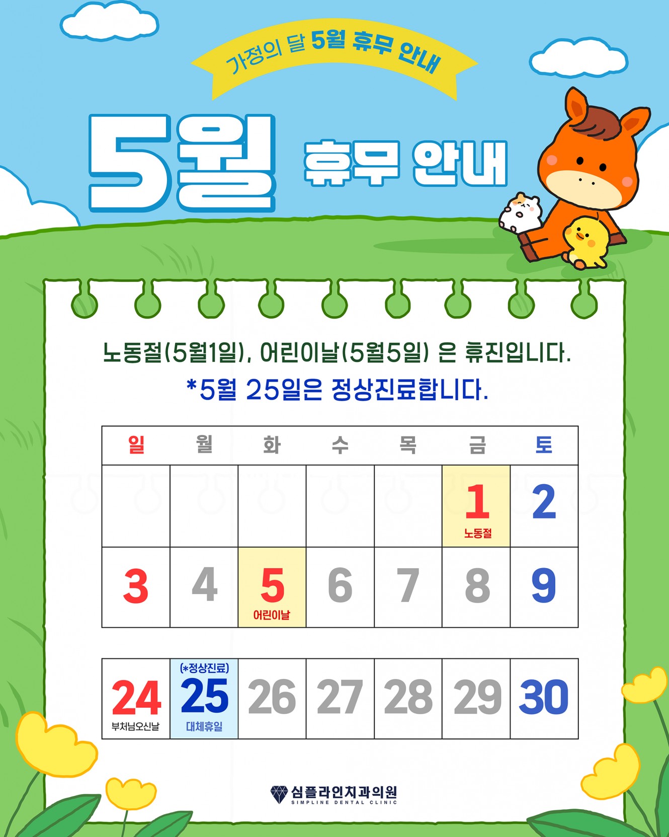 심플라인치과의원은 5월 1일(노동절), 5월 5일(어린이날) 휴진입니다.